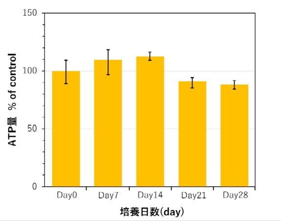 培養日数に伴う生存率(ATP量)の変化:1か月間、約90%以上のATP量を維持しております。培地交換は週1回の頻度で長期培養が可能です。
