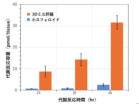 小スフェロイドとミニ肝臓での代謝反応容量の比較:3Dミニ肝臓は小スフェロイドにくらべ、高い薬物代謝機能を保持しております。