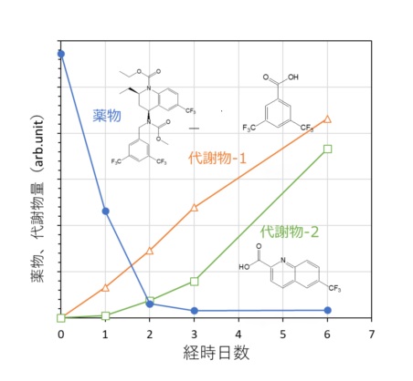 - 培養日数とともに、薬物(未変化体)が減少し、2種類の代謝物が産生し、培地中に蓄積する様子が観測できました
