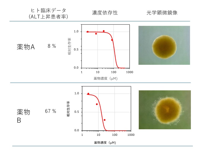 - ヒト臨床で肝毒性が高いことがわかっている薬物Bの方がより低い濃度で生存率の低下がみられました