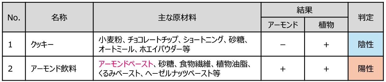本検査によるアーモンドの有無につきましては、検査結果だけでなく原材料や製造記録の確認等、他の方法と合わせてご判断ください。
