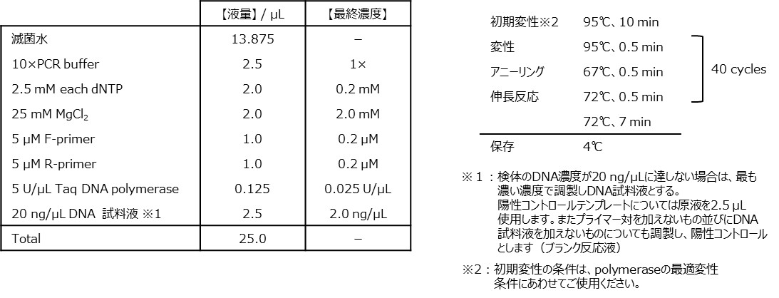 検査を行うにあたり、植物共通プライマーキットまたは動物共通プライマーキットを用いて、DNAの抽出状態を確認することをお薦めします。