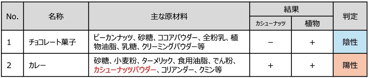 本検査によるカシューナッツの有無につきましては、検査結果だけでなく原材料や製造記録の確認等、他の方法と合わせてご判断ください。