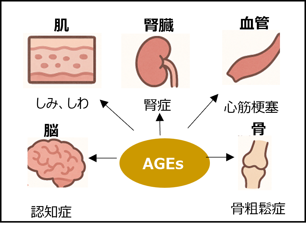 蓄積されたAGEsは炎症や酸化ストレスを引き起こし、多くの疾患の一因になると報告されています。