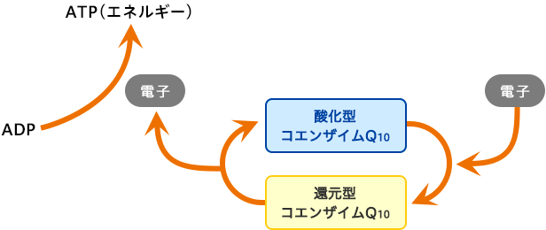 コエンザイムQ10(化合物名:ユビキノン)は牛の心臓から発見された成分で、ヒトにおいても心臓、肝臓、腎臓、膵臓で多く含まれる成分です。コエンザイムQ10は生体内でも合成することが出来る成分で、細胞がミトコンドリア内でATPを作る過程において、電子のやり取りの介在に必須な成分です。また、コエンザイムQ10はこの電子のやり取りができる構造であることから、酸化型と還元型が存在します。コエンザイムQ10には加齢とともに体内量が減るという報告や、生体内におけるビタミンEの酸化を抑えるという報告もあります。