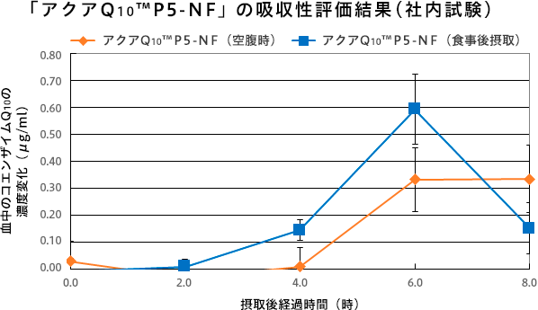 コエンザイムQ10結晶は、融点が約50℃のため、室温や体温では固体です。固体のままでは体内に吸収されないため、油に溶けた状態で水に分散される必要があります。そのため食事と同時に摂取することが推奨される場合がありますが、「アクアQ10™P5-NF」は水に分散しやすいため、空腹時でも一定の吸収性が認められています。